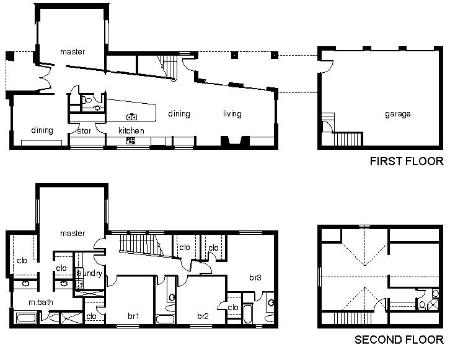 Like most of Bill May’s projects, the form of the Rice Residence grew out of detailed programming process resulting in a conceptual diagram of the house. After investigating many alternatives an idea emerged, a diagonal plane which directed flow from the front and rear within a rectangular structure. This proved to be the “big idea” which makes this home both unique and functional. The heart of this home is a large open room including the kitchen, bar, dining and living functions. Double pocket doors at the end of the entry foyer separate this space from formal living and dining rooms in the front of the house. When open, these doors provide a long vista from the front door. |