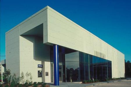 This small, sculptural building was designed as a “temporary structure” to accommodate the needs of this new bank until the owner-developer could move the bank into facilities in an office tower planed on adjacent property. |