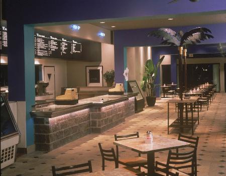 Café Express, Post Oak, located in an upscale retail mall, became the prototype for several later restaurants in the successful chain. Elegant use of simple materials and finishes made this design both dramatic and economical. Brightly colored post and beam “portals” were used to modulate the long, linear space and define the bar area, the entry and two dining areas. Contrasting textures and colors make the space a vibrant dining experience. |