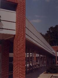 | Red brick "Portals" punctuate the anchor positions of this suburban shopping center. A crisp white sign band connects the towers and utilizes a unique system consisting of channels recessed into the façade providing for secure attachment and electrical for signage without making holes in the facade. |