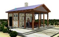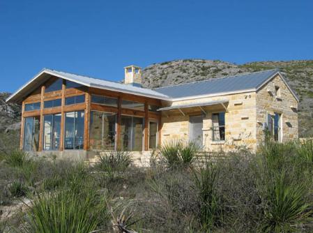 This project is a weekend wilderness retreat for two friends and their families. Located an hour from Del Rio on the Devil’s river, it was to provide a Spartan shelter, slightly more elegant than the old leaking trailer it replaced. During the evolution of the project it evolved from a simple pavilion with a small kitchen and bath (top- left) to an air conditioned two bedroom, three bath weekend home (bottom-left). In the final version, the limestone structure containing bedrooms, baths, kitchen and storage references many of the buildings of the old West Texas frontier forts. The pavilion with its massive limestone fireplace remains as the main living room with open views of the mountains and river. |