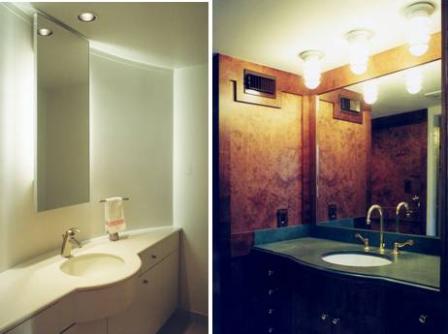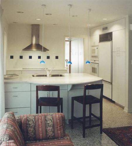 | This well designed 50's era home has now been almost completely renovated, a room at a time. The kitchen was opened to the den with a dining bar counter with storage on both sides. A stainless hood on a clean white tile back wall is a focal point for the space. An oven, refrigerator and storage are built into the wall at the end of the kitchen aisle to give ample storage and a clean look. The small size and paneled walls upstairs bath along with nautical light fixtures give the illusion of a luxury yacht. The small powder room features built in storage and a curved wall in a neutral palette to create a fun, but serene space. |